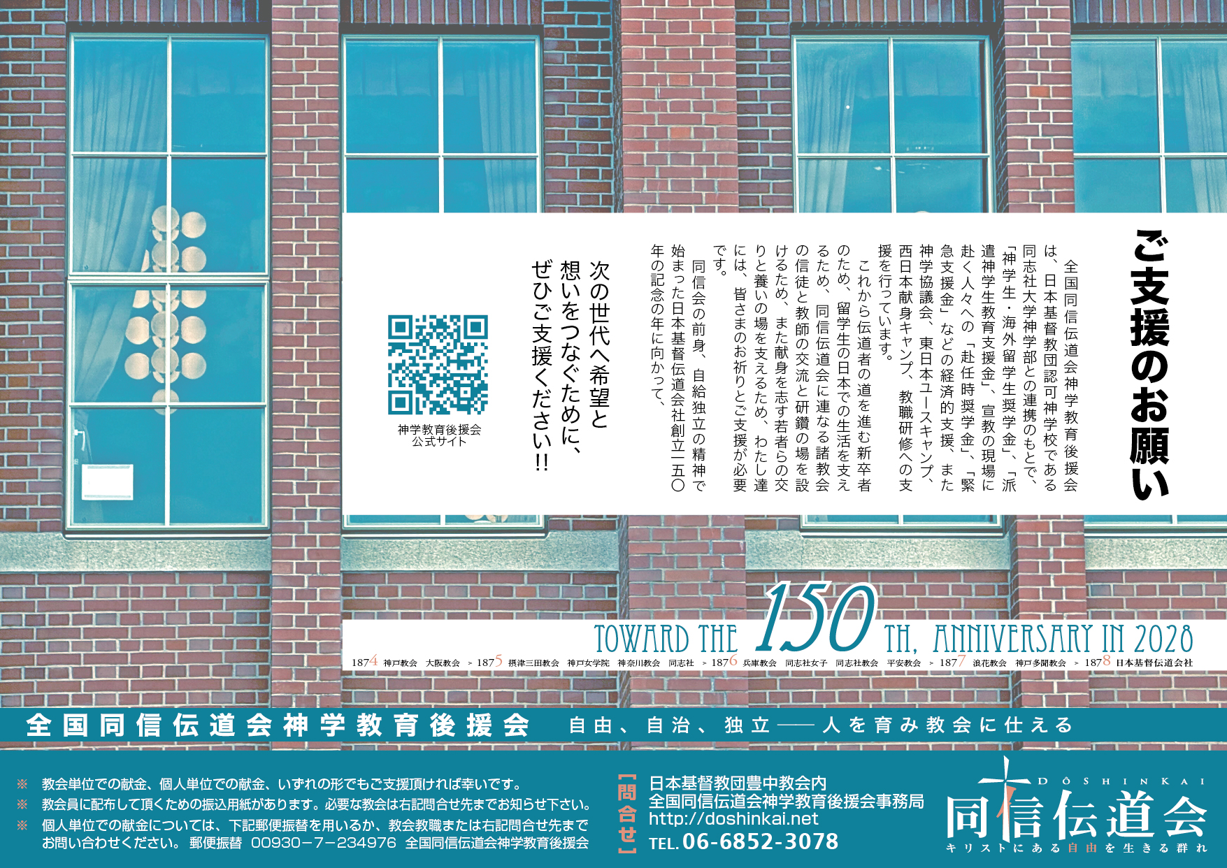 目標:400万円 郵便振替口座:00930-7-234976 ※ 他の金融機関からの振込の際は、下記の振込用の店名・預金種目・口座番号を ご入力ください。 (銀行名)ゆうちょ銀行(店名)099(〇九九)(預金種目)当座 (口座番号)0234976 ※ 振替手数料値上がりのため、寄付金振り込みの際はできるだけATMかインターネットをご利用ください。 ※ 銀行振込の場合、基本的に領収書は発行いたしません(振込時に発行される振込明細書をご利用ください)。領収書が必用な方は、その旨をお知らせいただければ発行いたします(その際、PDF形式でのメール送信もしくは領収ハガキ郵送のどちらをご希望かをお知らせください)。 全国同信伝道会神学教育後援会 募金事務局: 〒560-0024 大阪府豊中市末広町1-2-28 日本キリスト教団豊中教会内 電話(06)6852-3078 FAX(06)6855-1081 メール doshinkai.koenkai@gmail.com 募金事務担当 山﨑 道子(豊中教会牧師)